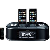 An alarm clock and FM/Weather radio with dual iPod docks. Click to enlarge.